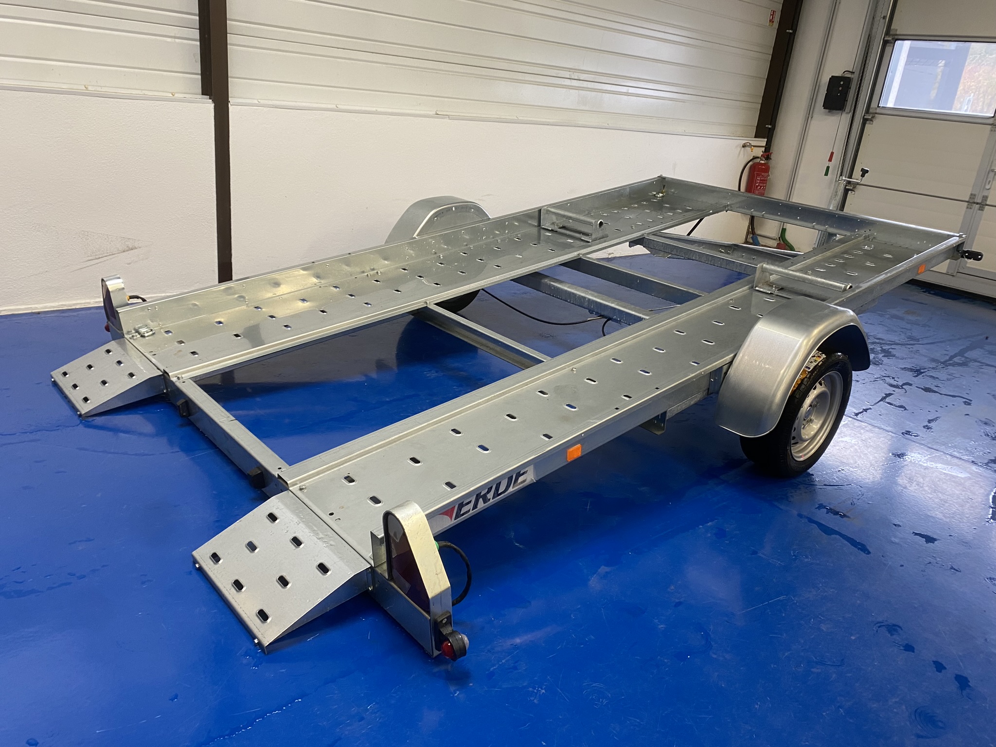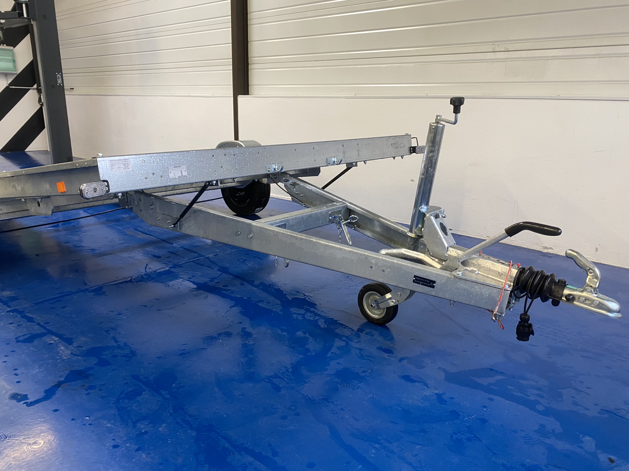 Porte voiture roues extérieures 4 anneaux d’arrimage Bec de chargement fixe (36 cm) Rails larges et sans rebord (pour voitures à voie étroite) 2 vérins à basculement